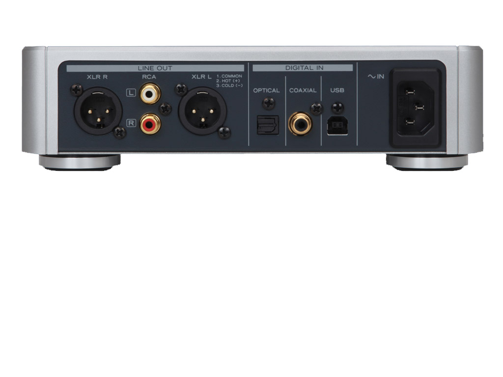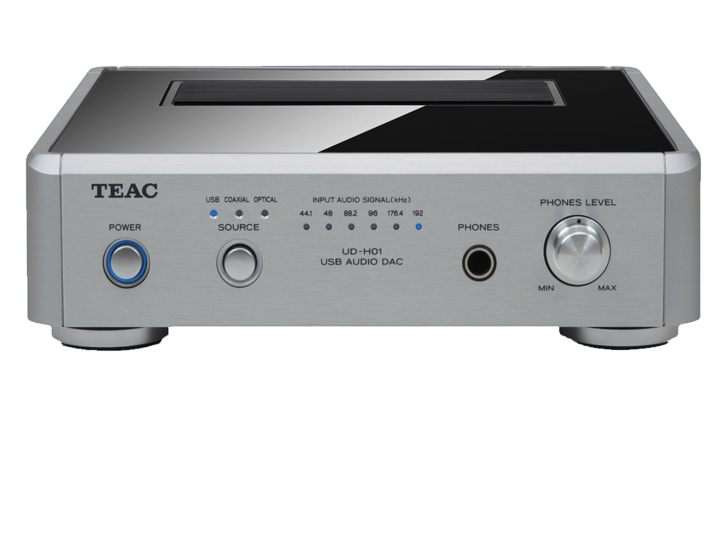 TEAC UD-H01 - представляет собой ЦАП преобразователь, соответствующий классу и дизайну новой референсной линейки TEAC. В правой части расположен полноразмерный выход для наушников с собственным регулятором громкости и усилителем, построенным на микросхеме JRC4580D. В центре находятся шесть индикаторов частоты дискретизации. Установлен миниатюрный кнопочный селектор входов с 3 светодиодами, указывающими на то, какой разъем в данный момент используется.