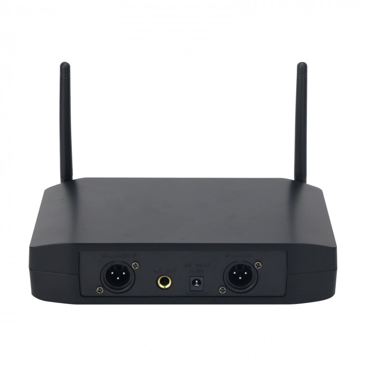 Компактний приймач оснащений двома телескопічними антенами, LED індикаторами радіо- і аудіосигналу, а також індивідуальними регуляторами гучності для кожного мікрофона. Розміщені на задній панелі виходи XLR і 1/4" джек дозволяють легко підключитися до більшості мікшерів, домашніх кінотеатрів, систем караоке або до активних акустичних систем.