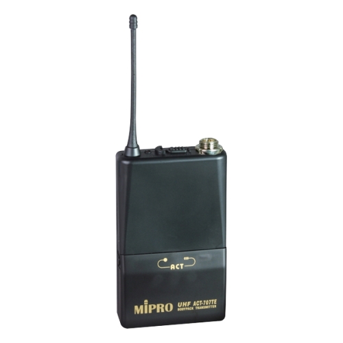 Mipro ACT-707TЕ - високоякісний передавач, призначений для підключення петличних мікрофонів/гарнітур. Модель має компактний пластиковий корпус, малу вагу та зручну для носіння форму з кріпленням на ремінь. Один із перших передавачів, оснащених функцією ACT. При натисканні кнопки ACT на панелі приймача, канал передавача автоматично підключається до каналу приймача. Передавач сканує радіодіапазон по 16 каналах, кожен канал шириною 24 МГц. Сигнал генерується за допомогою PLL-синтезу. Для швидкого та надійного підключення мікрофона використовується стандартний для Mipro 4-контактний Mini-XLR роз'єм (TA4F). Також до передавача можна підключити гітару. Вхід має регулювання рівня. Використана нова технологія Photo-cell Coupling гарантує широкий динамічний діапазон і високу якість ланцюга модуляції, що дозволяє підключати до передавача джерела з високим рівнем вихідного сигналу без спотворень та без шкоди для якості звуку. Передова ефективна технологія передачі сигналу дозволяє знизити енергоспоживання та збільшити термін служби батареї Крона 9 V. Максимальна девіація ±68 кГц, вихідна потужність 30 мВт, максимальний вхідний рівень до 0 дБ.