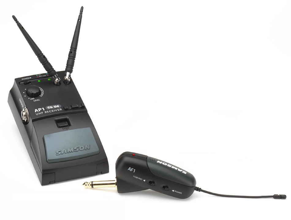 У комплект входить мініатюрний передавач AF1 для гітар типу Fender із системою шумозаглушення SAW, LCD-індикатором рівня сигналу та атенюатором -15 дБ.
