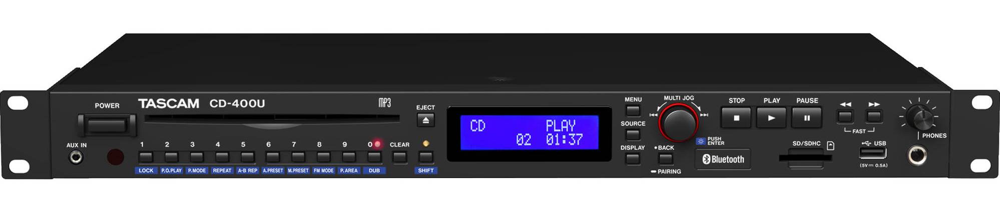 Tascam CD-400U — ідеальний CD-програвач із повним набором функцій, включно з: бездротовим зв’язком Bluetooth, підтримкою карт SD, порту USB та тюнера AM/FM. Також є функція запису з різних джерел через медіаплеєр на симетричні виходи XLR, несиметричні виходи RCA та запис AM/FM тюнера. Наявність допоміжного 1/8" гнізда незамінна для будь-якого джерела звуку, а також роз’єм для навушників для контрольного моніторингу.