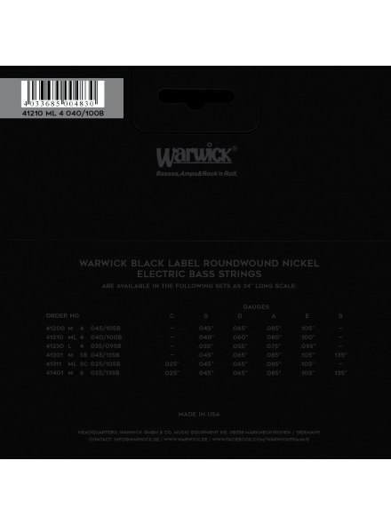 WARWICK 41210 Black Label, Nickel-Plated, Medium Light 4-String (40-100)