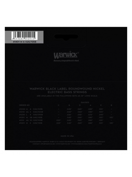 WARWICK 41401 Black Label, Nickel-Plated, Medium 6-String (25-135)