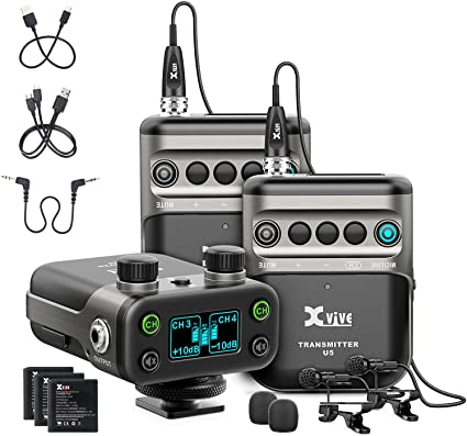 Xvive U5T2 поставляется с 2-мя поясными передатчиками и 2-мя петличными микрофонами, что позволяет передавать беспроводные сигналы с двух петличных микрофонов или других источников звука на DSLR камеру или рекордер.