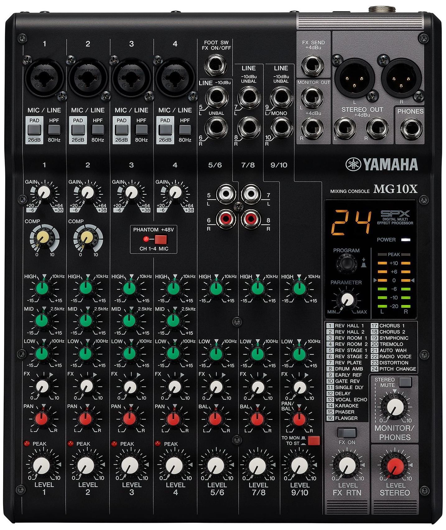 10-канальный микшер, 4 микрофонных, 10 линейных входов (4 моно + 3 стерео), 1 стерео шина, 1 шина AUX, 24 SPX эффекта, D-PRE, компрессор, ФВЧ 80 Гц, аттенюатор PAD.