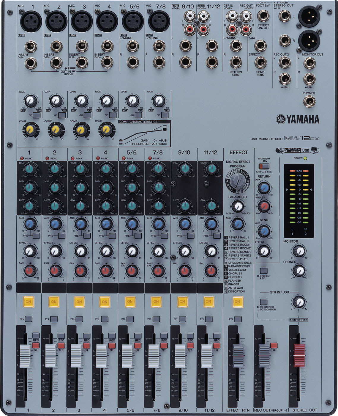 В модели MW12CX 12 входных каналов - четыре моновхода микрофон/линия и четыре линейных стереовхода. Два из стереовхода могут работать как микрофонные моновходы, что дает возможность использования до 6 микрофонных входов одновременно. У этих высококачественных балансных входов также есть переключатель фантомного питания, позволяющий воспользоваться преимуществами профессиональных конденсаторных микрофонов.
