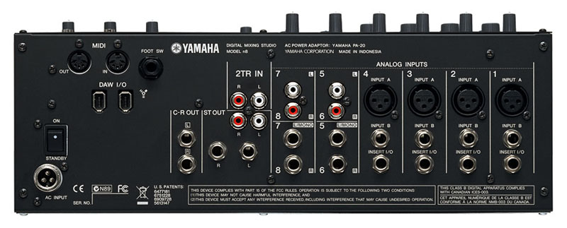 Yamaha N8 имеет 8 входных каналов (4 микрофонных и 4 линейных), также имеется 1 дополнительный стерео вход. Микрофонные каналы оборудованы разъемами Insert и высокоомными входами Hi-Z. Из выходов присутствуют основной стерео выход, мониторный выход для контроля и выход шины AUX, который совмещен с выходом на наушники. Кроме стерео шин Master и SOLO, микшер имеет две внутренних стерео шины AUX, одна из которых заведена на встроенный ревербератор, и отдельную шину REC, которая не имеет внешнего выхода, а подключена к одному из входов встроенной звуковой карты.