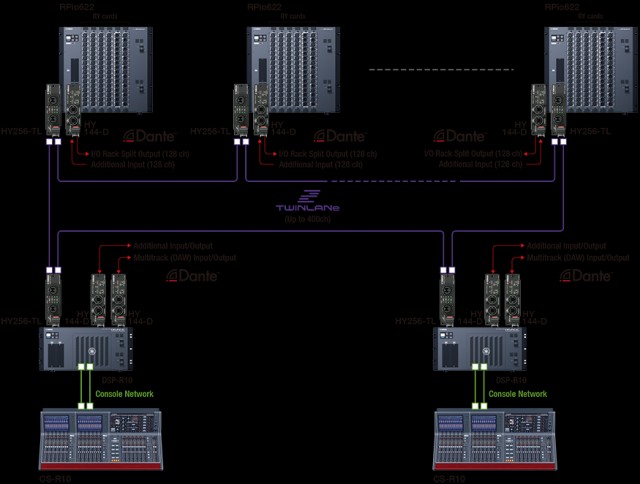 Панель управління CS-R10 і DSP модуль DSP-R10 з'єднані між собою через виділену замкнуту CAT5e мережу "Console Network." DSP модуль підключається до стейджбоксів RPio622 за допомогою нової замкнутої мережі TWINLANe з використанням оптичного волокна. Завдяки тому, що обидві мережі використовують прості кільцеві з'єднання, забезпечується резервне дублювання і максимально можлива надійність.