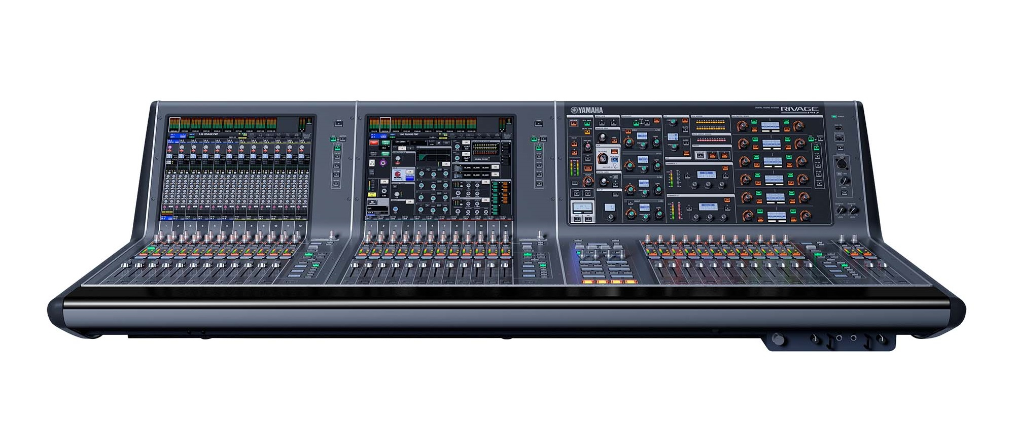 Панель керування RIVAGE PM7 має три групи по 12 фейдеров, для яких можна призначати канали в потрібній конфігурації. Дві крайні ліві групи фейдерів працюють з великими сенсорними дисплеями на верхній панелі, забезпечуючи розширене робоче середовище Centralogic. Поканальні лінійки переходять вертикально в дисплеї, для зрозумілого, логічного керування. Можливість керувати каналами групами по 12 забезпечує гнучкість практично для будь-якого робочого процесу.