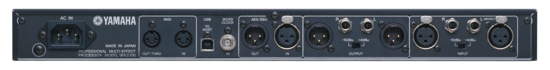 На задней панели SPX2000 расположены XLR и 1/4 TRS Jack разъемы для левого и правого каналов, а так же ереключатель чувствительности +4 дБ/-10 дБ для точной настройки выходного уровня. Цифровые подключения осуществляются через XLR-разъемы формата AES/EBU и разъему BNC WORDCLOCK IN. Разъемы MIDI IN, OUT/THROUGH и USB TO HOST предназначены для дистанционного управления и передачи данных от компьютеров, цифровых микшерных консолей и MIDI-устройств. На передней панели также расположен разъем ножного переключателя для управления темпом эффектов (tap tempo).