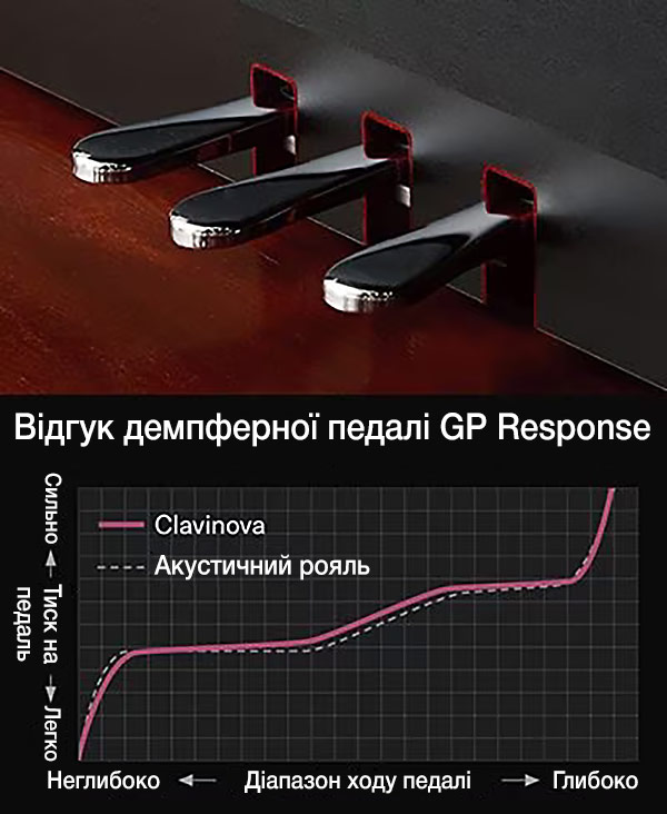 Демпферна педаль GP Response Damper Pedal, пропонує криву спротиву в стилі рояля, починаючи з легкої на дотик і тієї, що збільшується при подальшому натиску педалі. Це дозволяє музикантам звикнути до тонких нюансів педалювання.