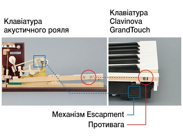 Клавіатури Clavinova оснащені механізмом, який відтворює це відчуття в нижній частині ходу клавіші. Вони були сконструйовані таким чином, що клацання помітне лише при найлегших натисканнях клавіш, як на клавіатурі рояля. Ці клавіатури були відрегульовані для забезпечення додаткового тертя, яке врівноважує репетицію клавіш і відгук без зниження ефективності.