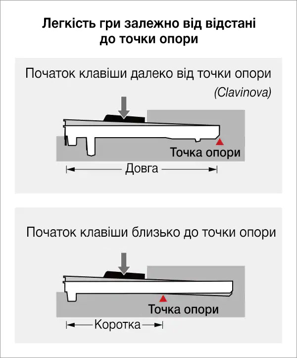 При грі на цифровому піаніно дальня частина клавіш, може викликати труднощі в повноцінному музичному самовираженні. Це тому, що дальня область клавіші знаходиться ближче до точки її опори. Чим ближче до цієї точки ви натискаєте клавішу, тим менше у вас важіль і тим більше сили потрібно застосовувати. Велика довжина клавіш GrandTouch, дає гравцеві довший важіль взаємодії, забезпечує більш виразний контроль навіть на дальній області клавіш. Це така ж довжина опори, що і у рояля преміум-класу Yamaha S3X (станом на липень 2020 г.), і це найдовша опора, яка використовується на будь-якому цифровому піаніно.