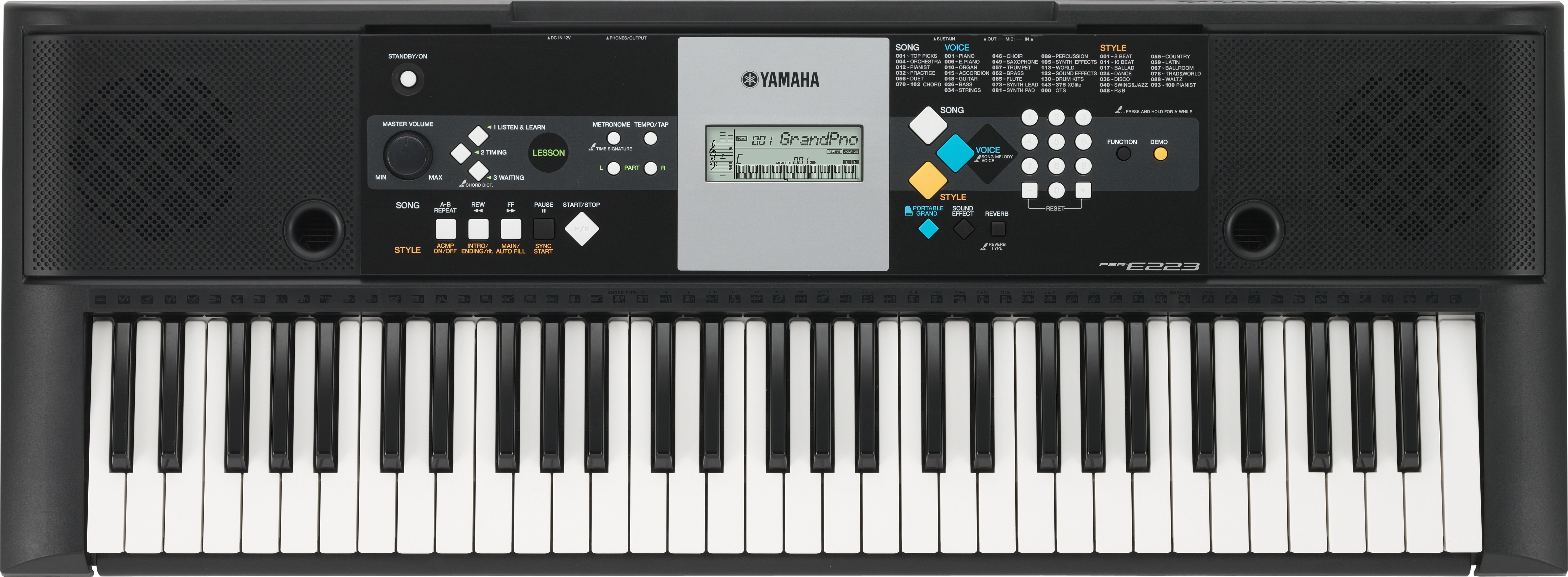 В PSR-R200 предусмотрены 375 высококачественных звуков, куда входят стереосэмплы рояля Stereo Grand Piano, 361 звук XGlite, 12 звуков ударных установок и набор звуковых эффектов. Кроме того, в PSR- E223 есть 100 стилей аккомпанемента и 102 произведения. Клавиша Portable Grand позволяет мгновенно вызывать качественно записанные стереосэмплы звука рояля. В инструменте также предусмотрен яркий эффект реверберации, который при исполнении добавляет в звучание акустику концертного зала. Обучение музыке и обычные занятия становятся увлекательными как никогда благодаря функции Yamaha Education Suite.