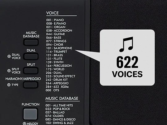 PSR-EW310 оснащена новітнім тон-генератором LSI від Yamaha, що забезпечує кращу якість звуку, яке коли-небудь пропонувалося в інструментах цього типу. Насолоджуйтесь 622 приголомшливими тембрами, включаючи гітару, бас, струнні, саксофон, трубу, барабани і перкусію, а також фортепіано, орган і інші класичні клавішні інструменти, які разом складають велику бібліотеку музичних звуків. Ви навіть можете накласти два різних тембру на всю клавіатуру як «Dual Voice», щоб ще більше збагатити ваше виконання!