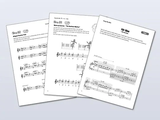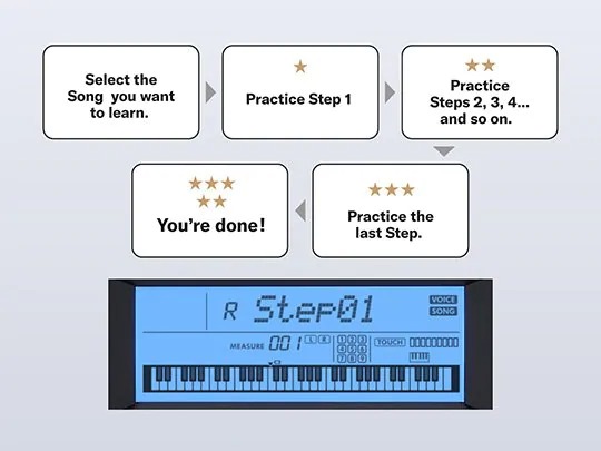 "Ключі до успіху" засновані на методиках навчання , які компанія Yamaha використовувала протягом багатьох років. Ви можете вибрати тільки ключові фрази композиції - ті, які вам найбільше подобаються або над якими потрібно працювати, - і практикувати їх одну за одною. Цей урок ідеально підходить для гравців-початківців. Кожна пісня складається з декількох кроків. Кожен раз, коли ви граєте до кінця поточного кроку, ваше виконання буде оцінюватися.