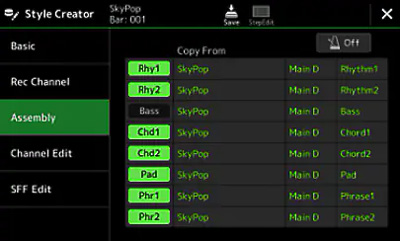 Вбудовані стилі автоакомпанемента складаються з безлічі інструментальних партій, таких як барабани, бас, гітара, піаніно і т. д. Функція Style Assembly дає можливість легко знаходити, прослуховувати і комбінувати ці партії незалежно від стилю, для створення твоїх власних унікальних акомпанементів!