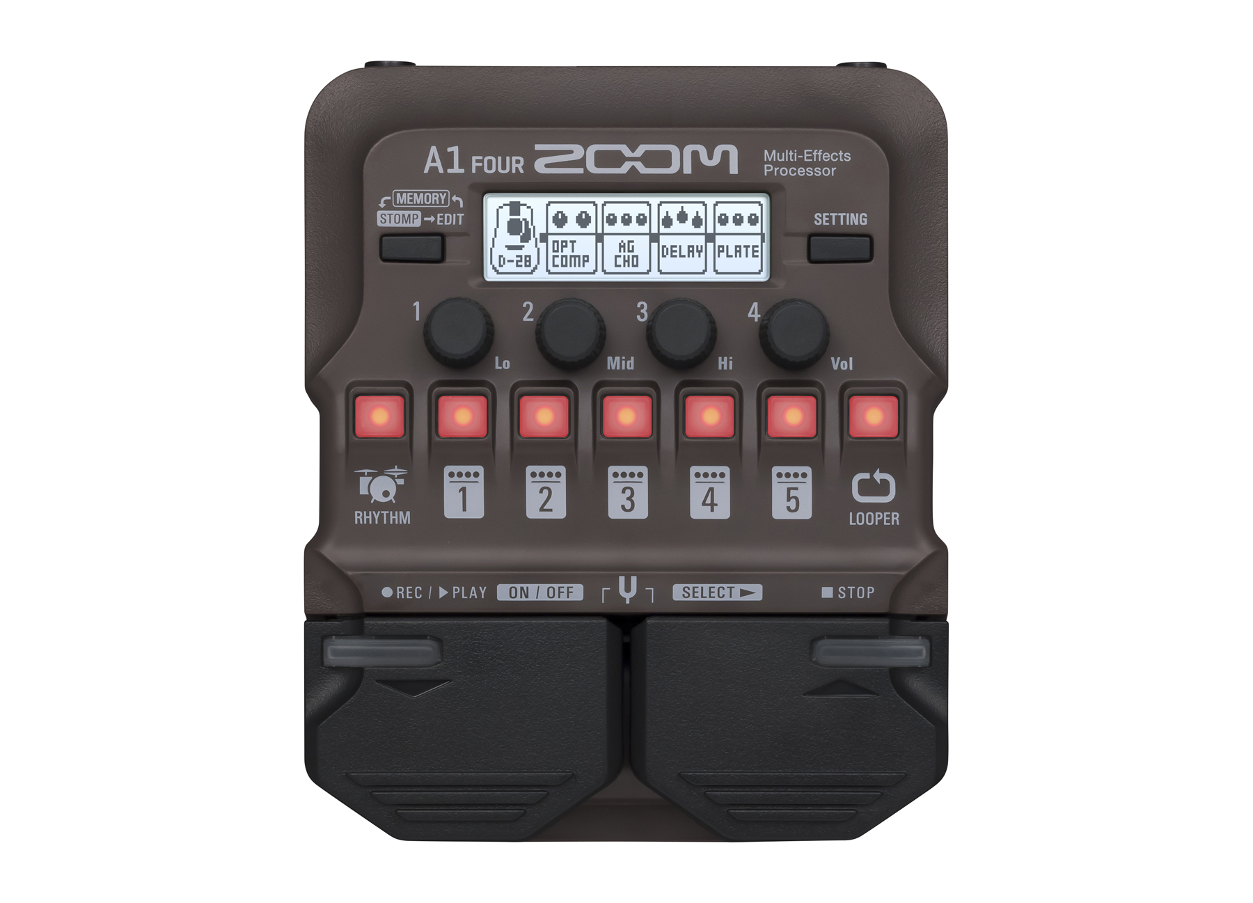 Легко переключайтесь между патчами и эффектами в двух режимах исполнения. Режим MEMORY позволяет легко программировать весь сет-лист, переходя от патча к патчу. Используйте режим STOMP, чтобы включать и выключать отдельные эффекты касанием вашей ноги.