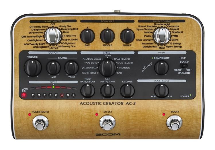 С процессором Zoom AC-3 все первостепенные функции будут под рукой. Высококачественный предусилитель позаботится об уровне сигнала и поможет воспроизвести особенности звучания акустической гитары. Вдобавок к этому, вы сможете отполировать тон при помощи трехполосного эквалайзера.